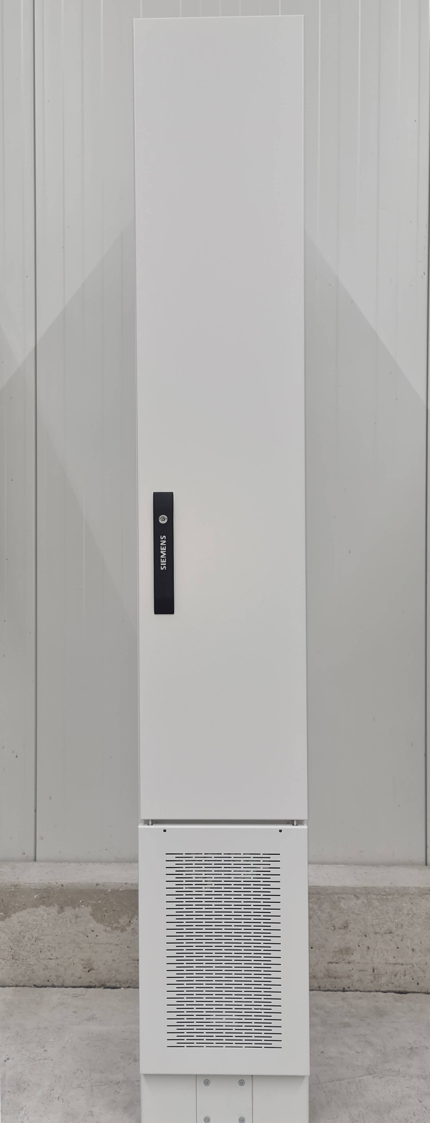 Das Stahlblech-Gehäuse hat in der kleinsten Ausbaustufe eine Außenabmessung von H=1950 x B=300 x T=400mm inkl. Sockel 100mm und ist dann mit einer ATICS-Umschalteinrichtung, einem IT-Trafo bis max. 8kVA und mit bis zu 18 Stück 2pol. abgesicherten Stromkreisen bestückt.