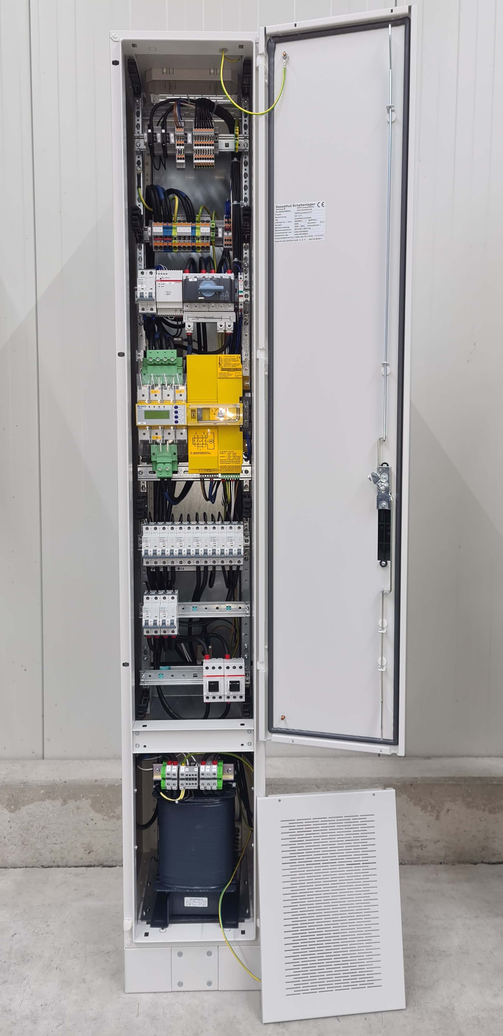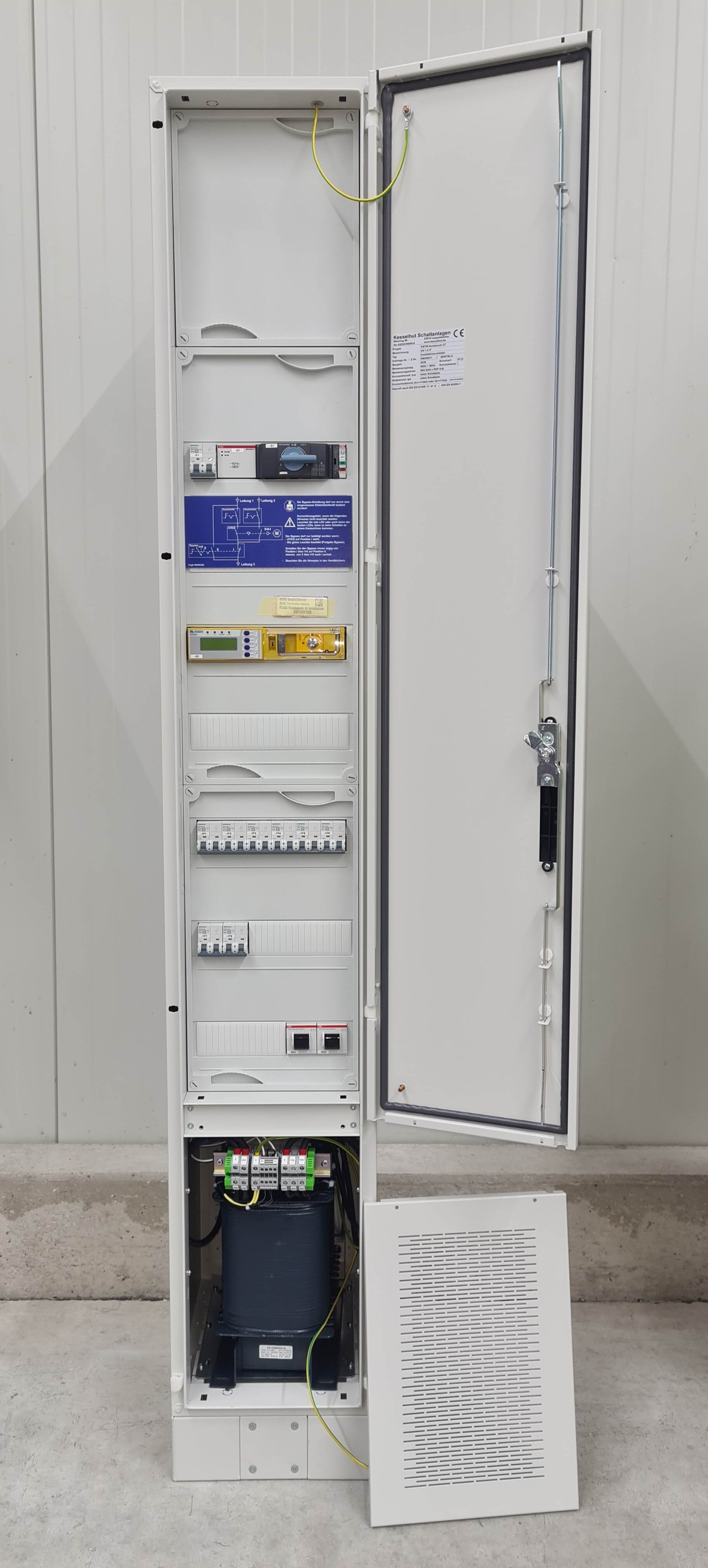 - Aufbau: Transformator im unteren, Schutz- und Anschlusskomponenten im oberen Schaltschrankbereich